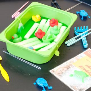 The Chinese Rice Cakes need to be placed in a boiling pot for 10 minutes. Placed into a container with water and food colouring for extra sluggyness. I have added various toys to go with the theme of water, tools to stir, scoop and pick up.